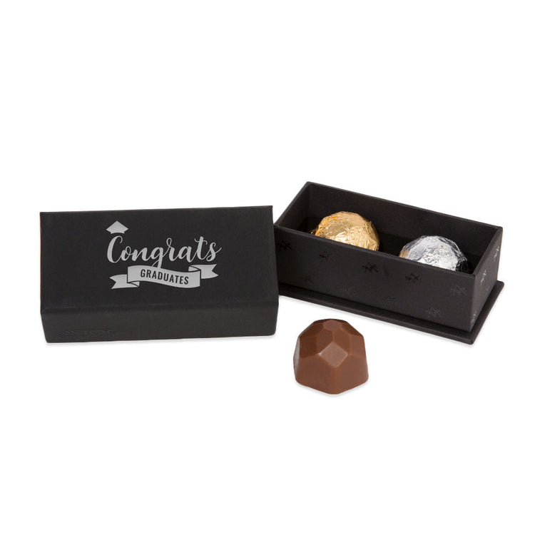Our Commencement Black Deco 2pc Truffle Box is a delicious and festive treat for your valued customers! Each box contains an assortment of 2 milk & white chocolate hazelnut truffles.