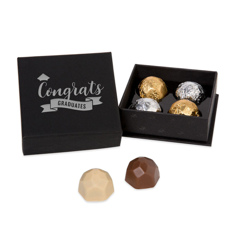 Our Commencement Black Deco 4pc Truffle Box is a delicious and festive treat for your valued customers! Each box contains an assortment of 4 milk & white chocolate hazelnut truffles.