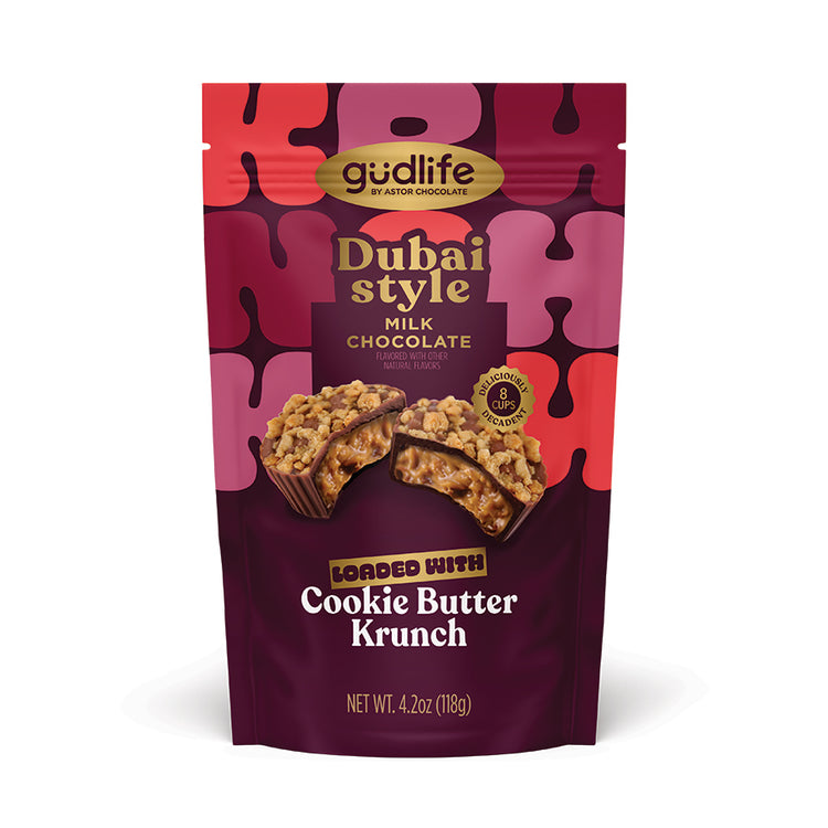 Our Gudlife Dubai Style Milk Chocolate Cookie Butter cups are a perfect treat for your valued customers. Each cup is crafted with milk chocolate, filled with cookie butter and topped with cookies to create a delicious treat. Each bag contains 8 delicious cups!
